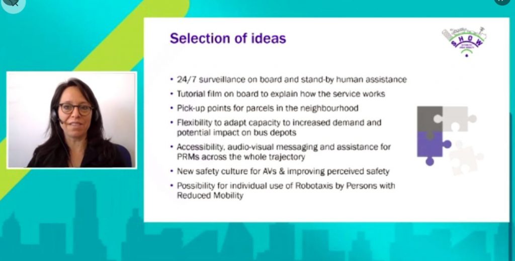 SHOW was presented by Project Coordinator Dr. Henriette Cornet from UITP, who highlighted the importance of citizens’ participation in AV pilots and the inclusion of people with reduced mobility, those less tech-savvy, among others.